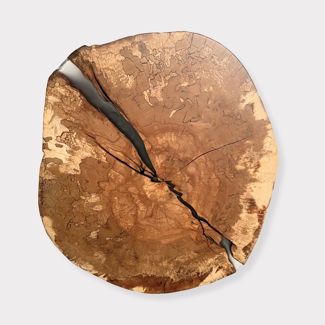 O masa de cafea unicat, realizata din sectiunea unui trunchi de fag cu insertie de rasina epoxidica in fisurile principale.