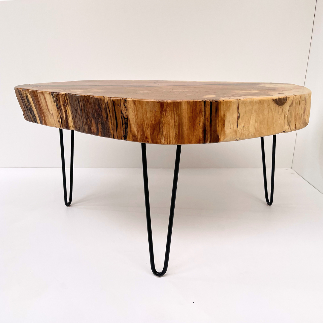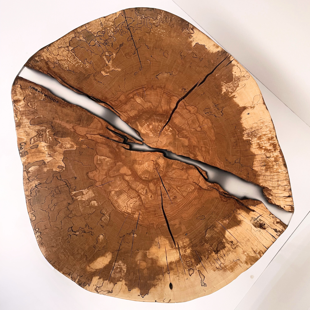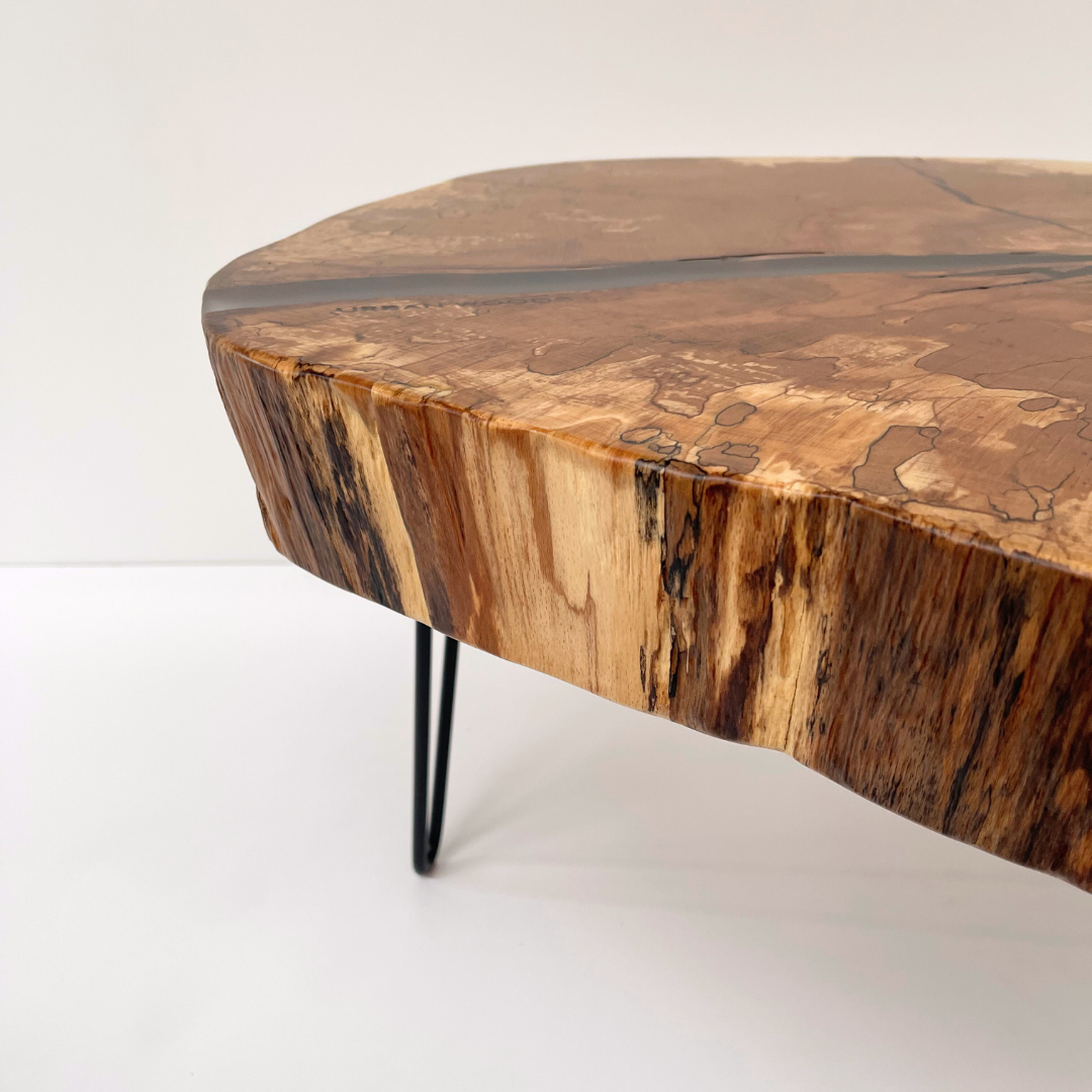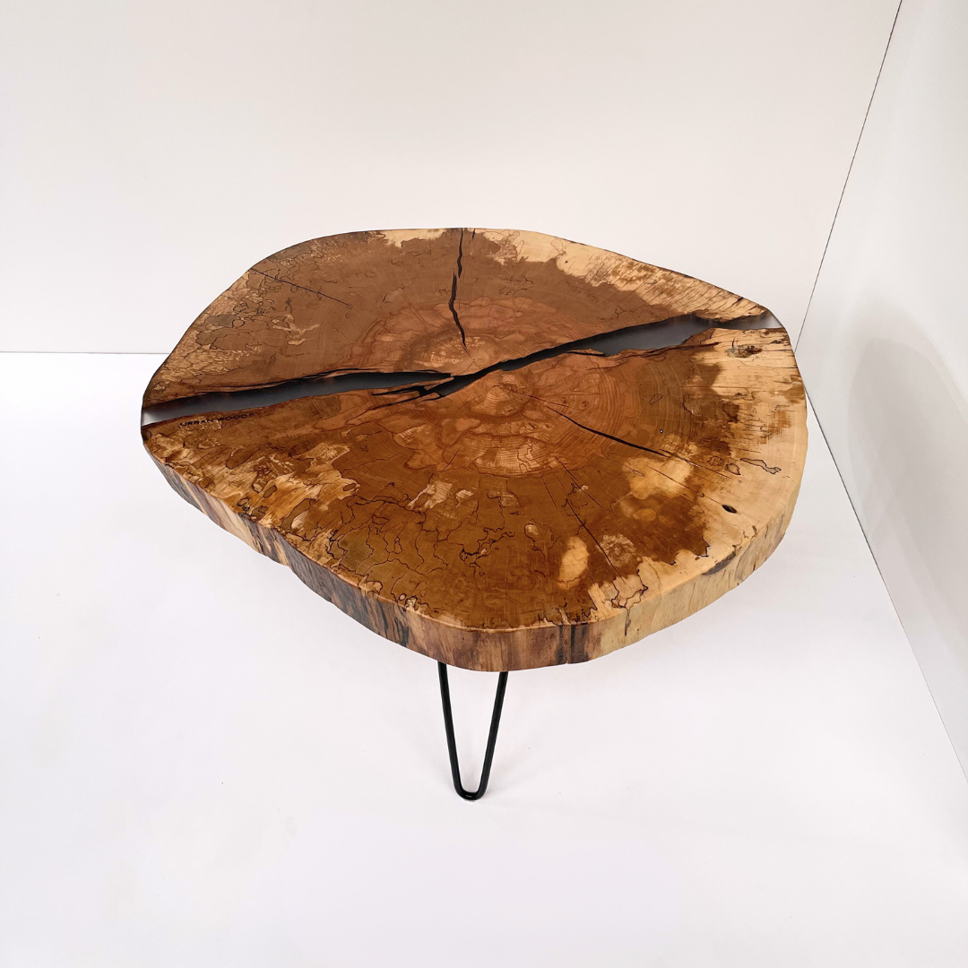 O masa de cafea unicat, realizata din sectiunea unui trunchi de fag cu insertie de rasina epoxidica in fisurile principale.