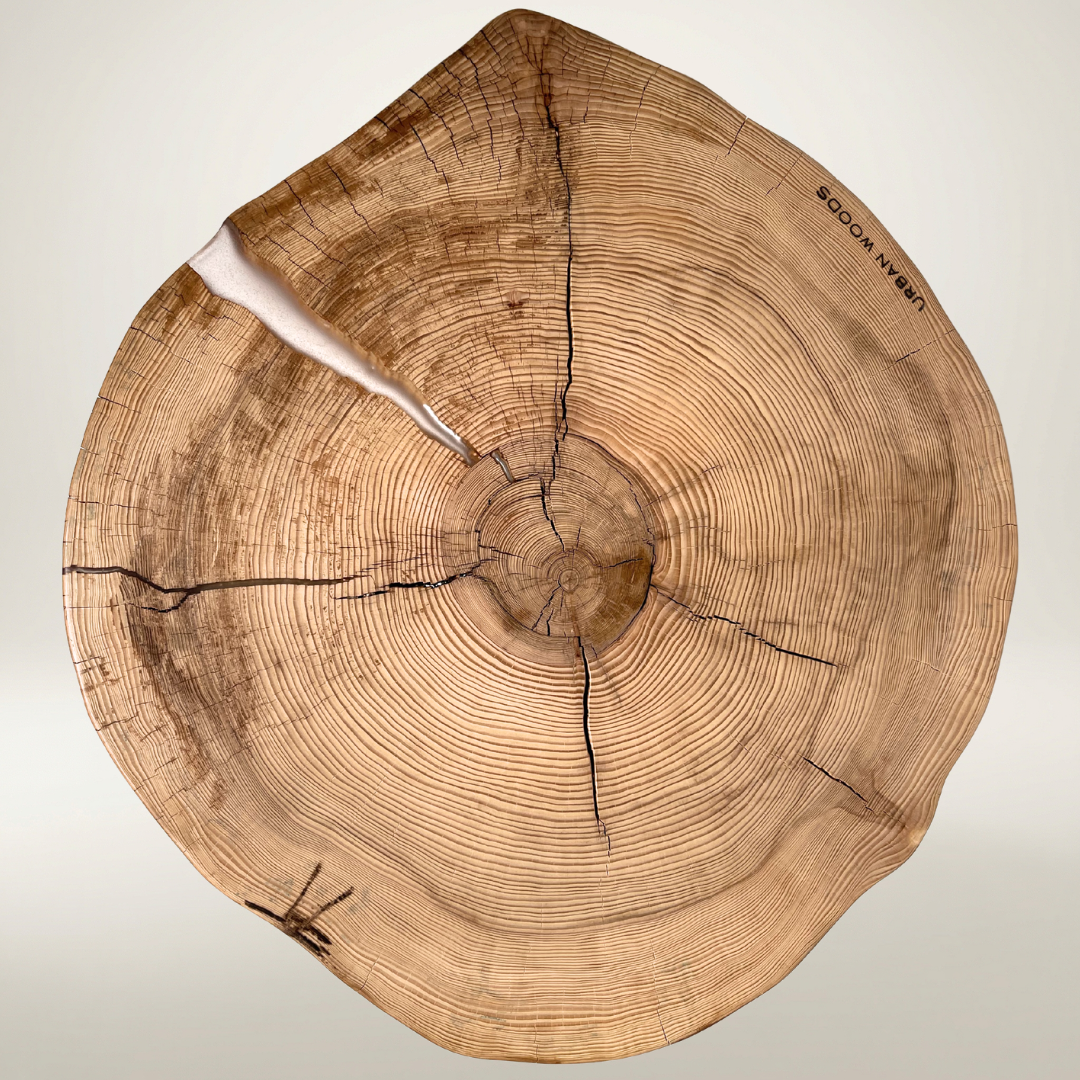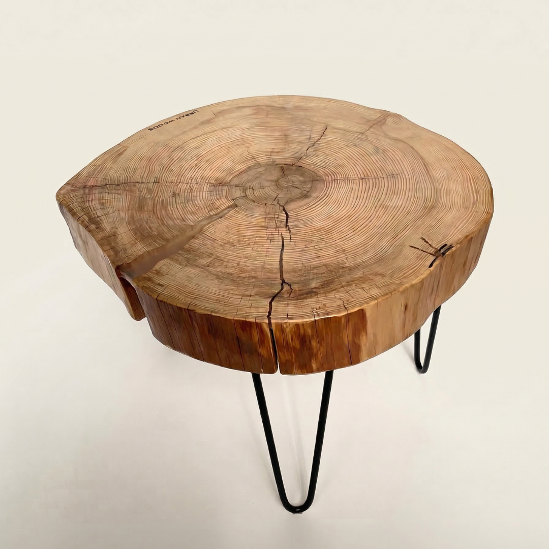 O masa de cafea unicat, realizata din sectiunea unui trunchi de molid cu insertie de rasina epoxidica.