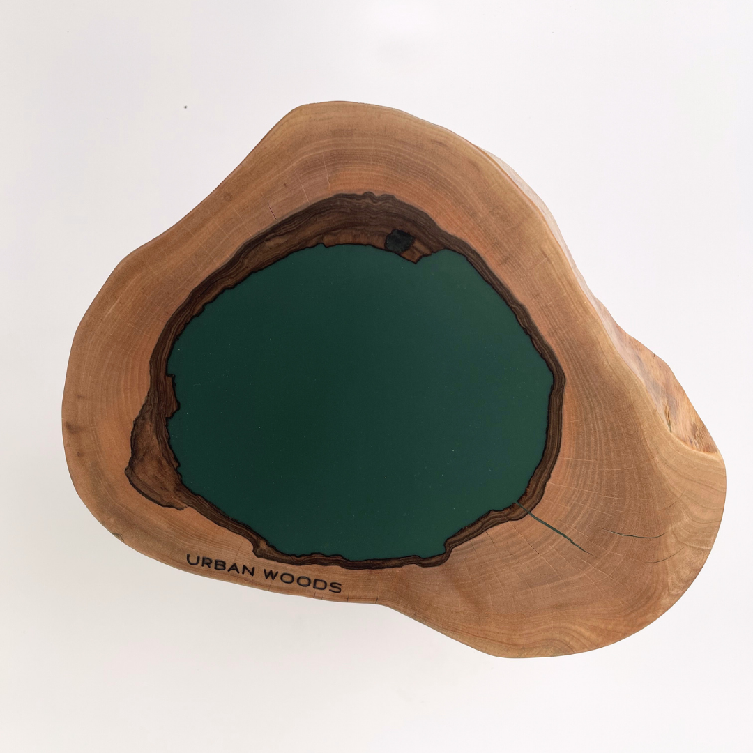O masa de cafea unicat, realizata din sectiunea unui trunchi de nuc cu insertie de rasina epoxidica verde.