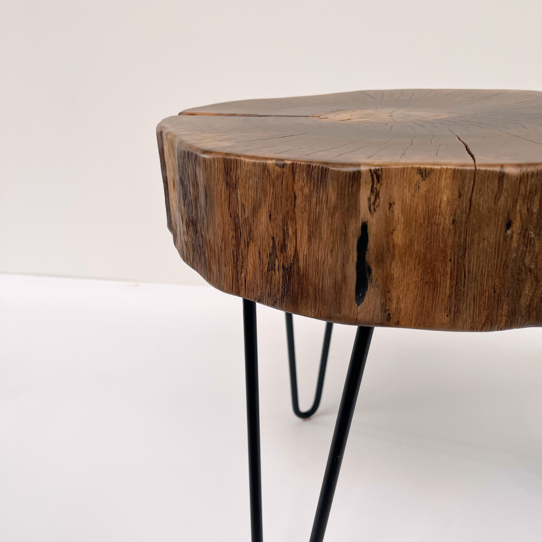O masa de cafea unicat, realizata din sectiunea unui trunchi de nuc cu insertie de rasina epoxidica transparenta in fisurile principale