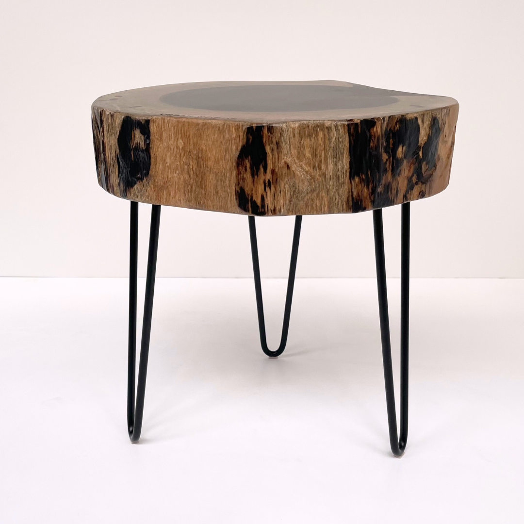 O masa de cafea unicat, realizata din sectiunea unui trunchi de nuc cu insertie de rasina epoxidica neagra.