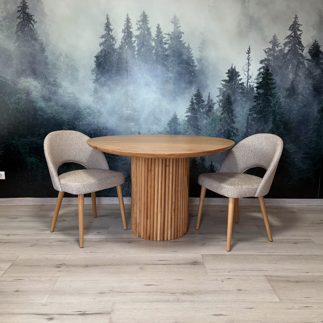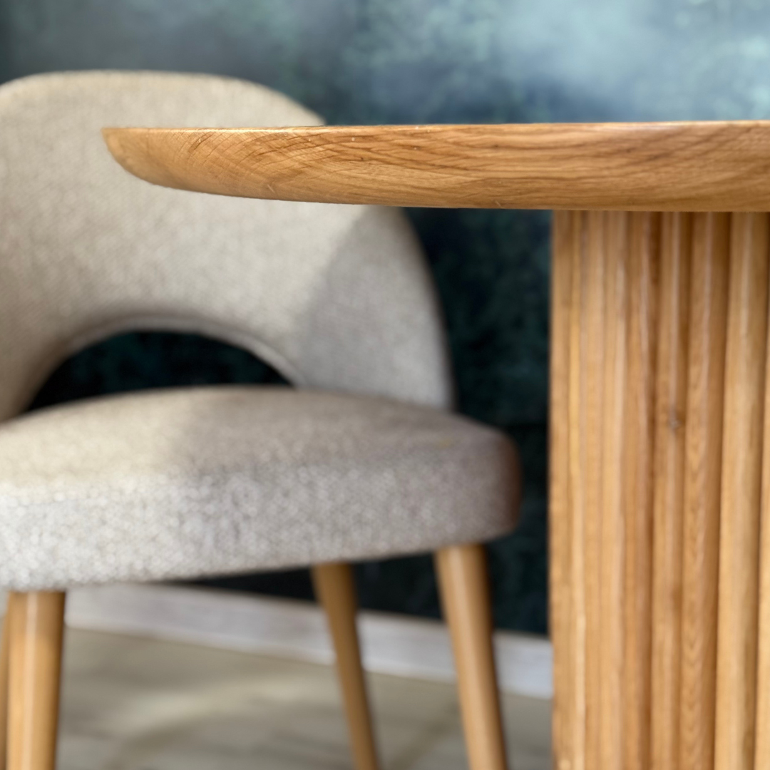 O masa de dining realizata integral din stejar masiv ce se face remarcata prin forma organica a blatului si prin forma rotunjita a cantului. Caldura lemnului nu a fost nicicand mai aproape de tine.