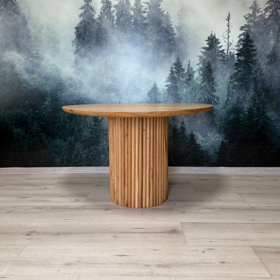 Blat realizat din lemn masiv de stejar cu diametrul de120cm, cu picior Nero central.
