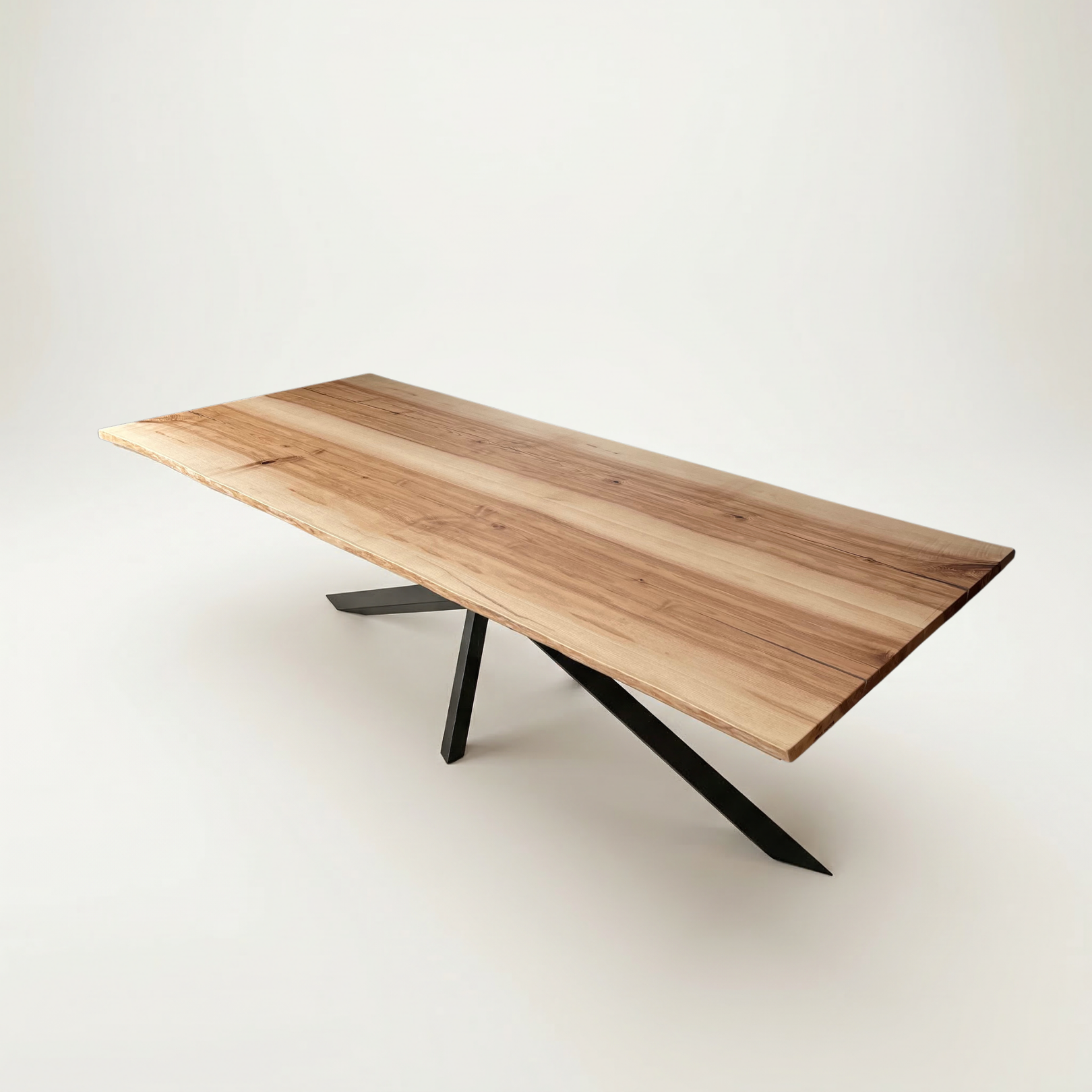Un blat brut din lemn masiv de frasin cu nuante contrastante ce are dimensiunea de 285x118x4cm, cu canturi natural neregulate si picior metalic central Geometry vopsit negru.