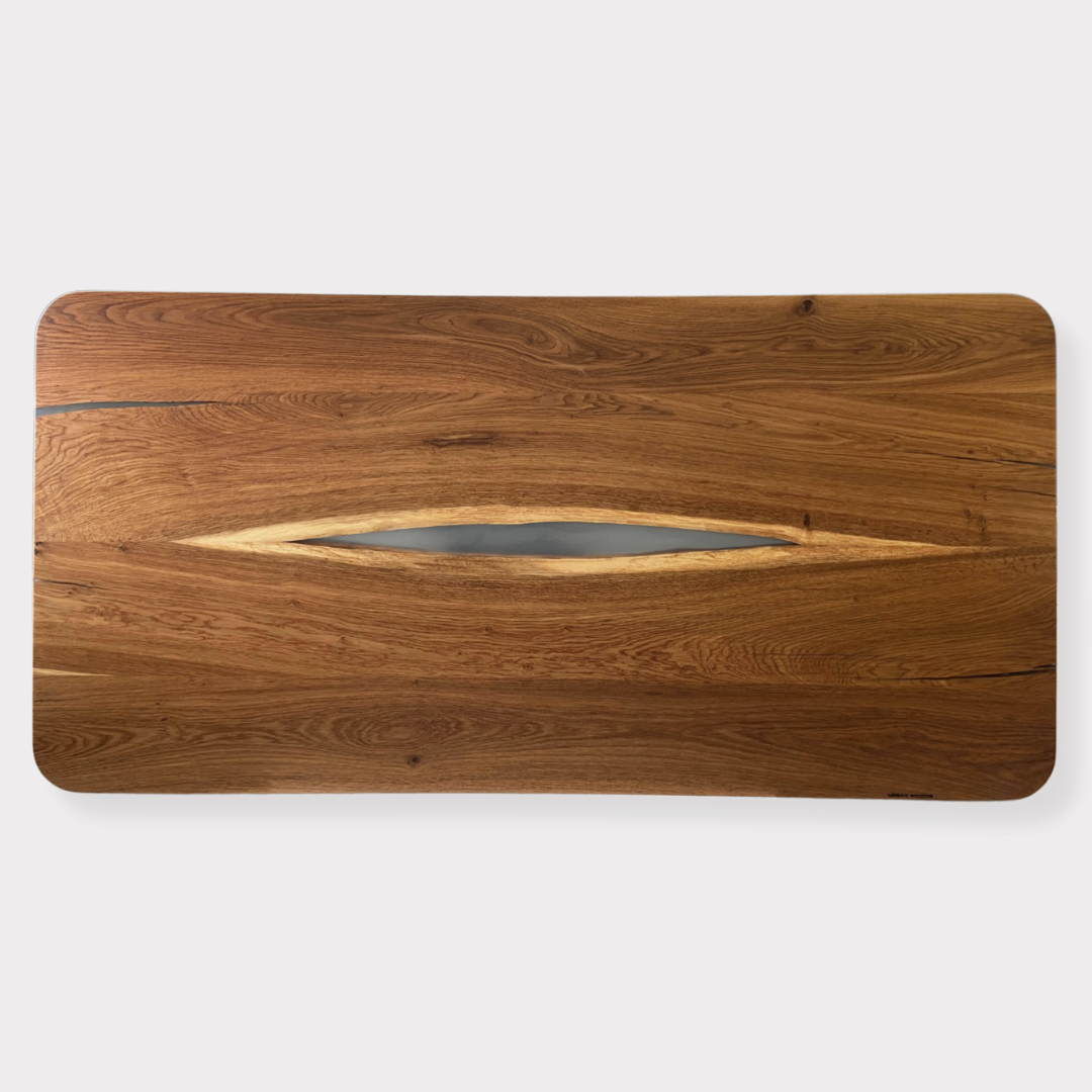 Un blat din stejar ce este in mod natural mai pigmentat, cu o fanta de rasina epoxidica transparenta in mijloc. Canturile si coltutile blatului au o frezare Minimal in partea inferioara ce da impresia de blat mai subtire, minimalist. Rasina epoxidica ce s-a turnat in fisurile acestui blat evidentiaza atat de frumos imperfectiunile, niveland totodata perfect suprafata blatului.