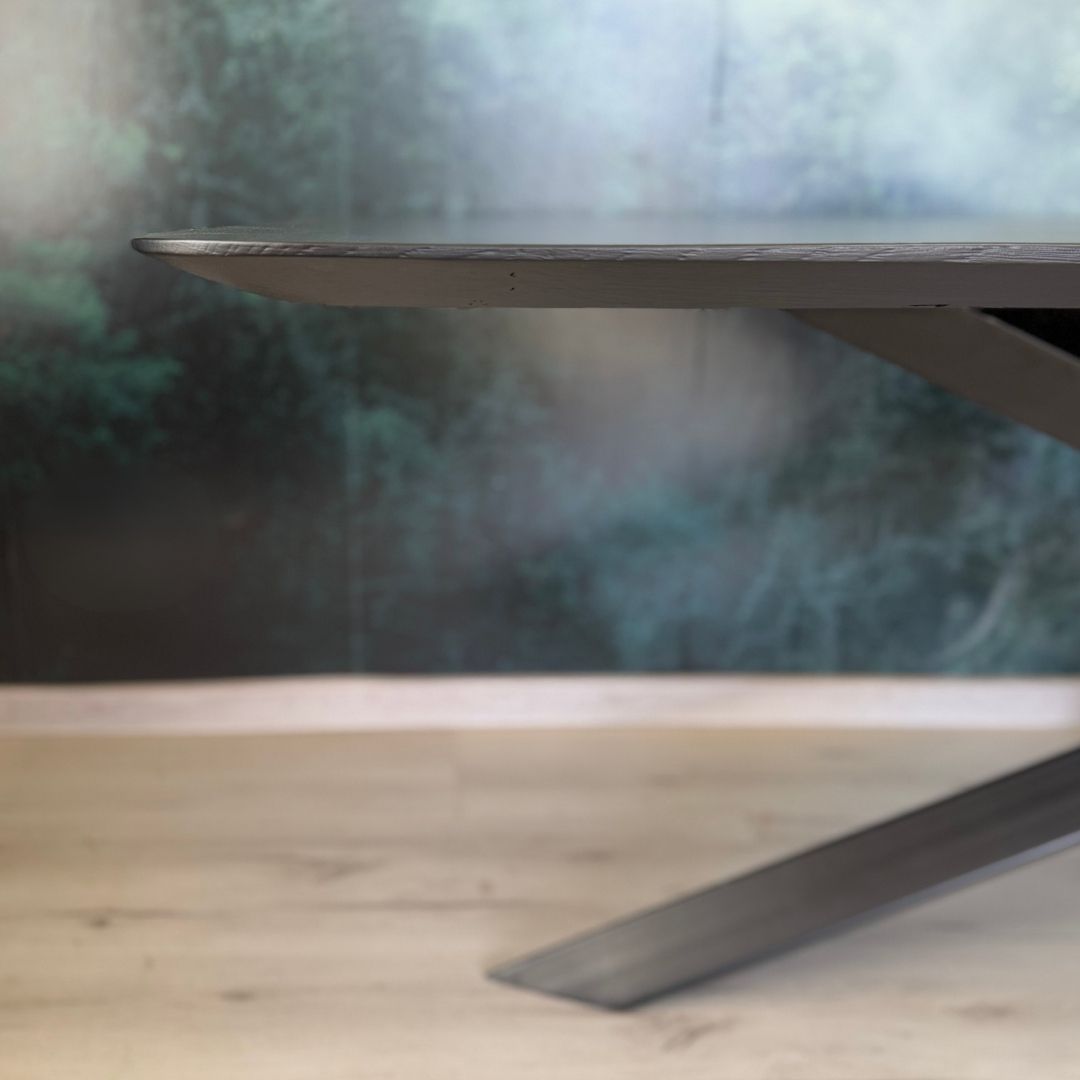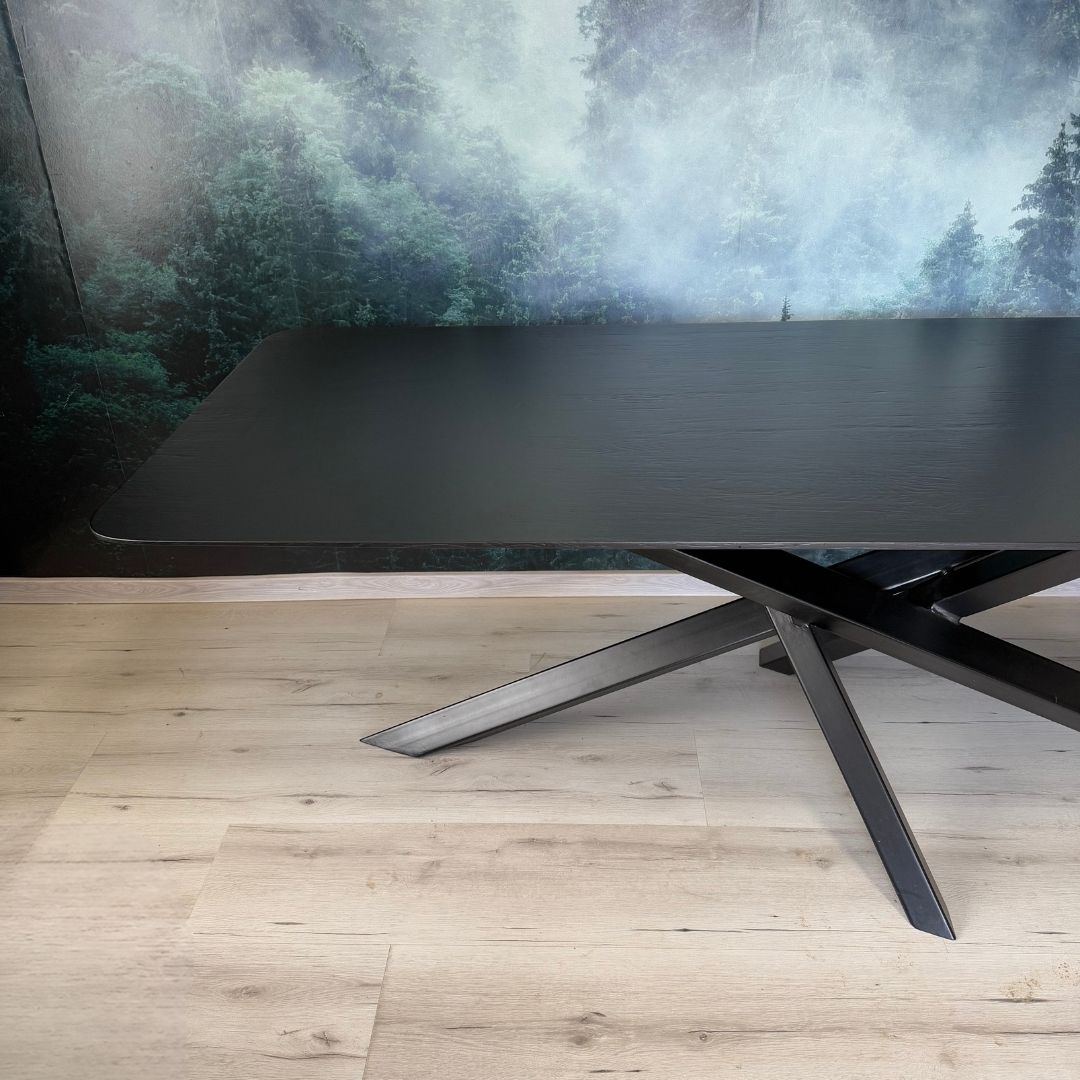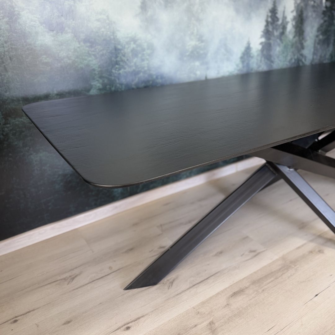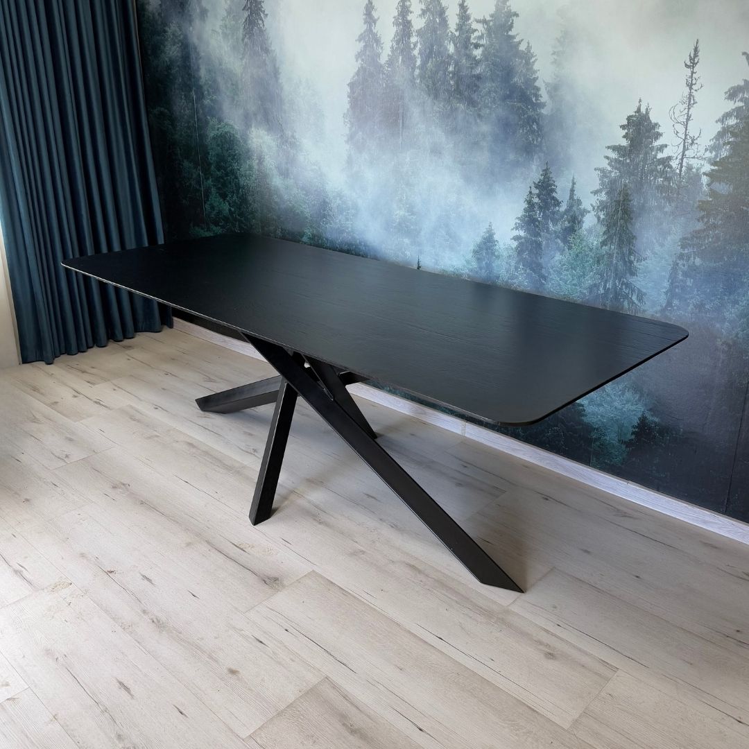 O masa de dining cu design atemporal cu blat realizat din stejar masiv vopsit negru, cu frezare Minimal pe cant.