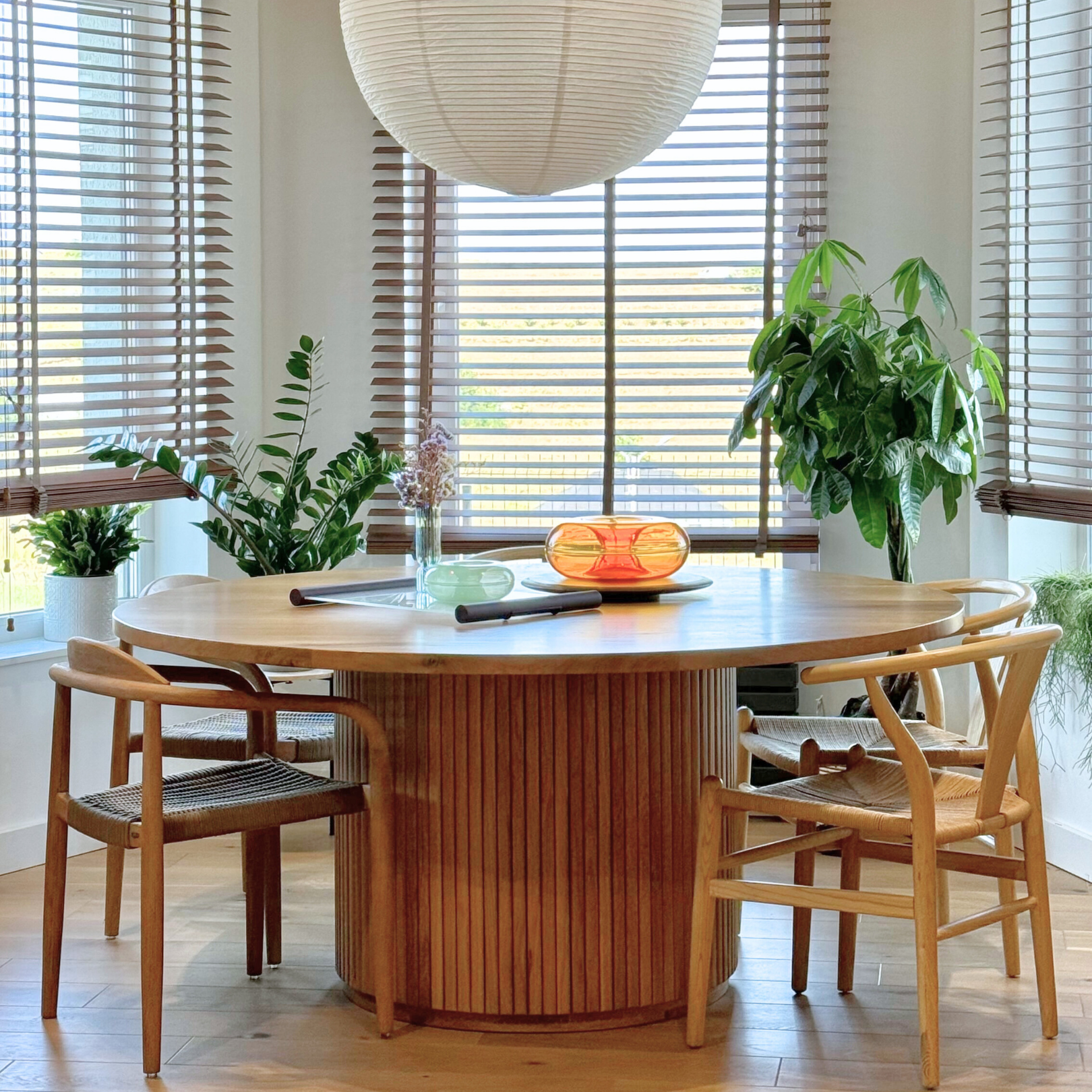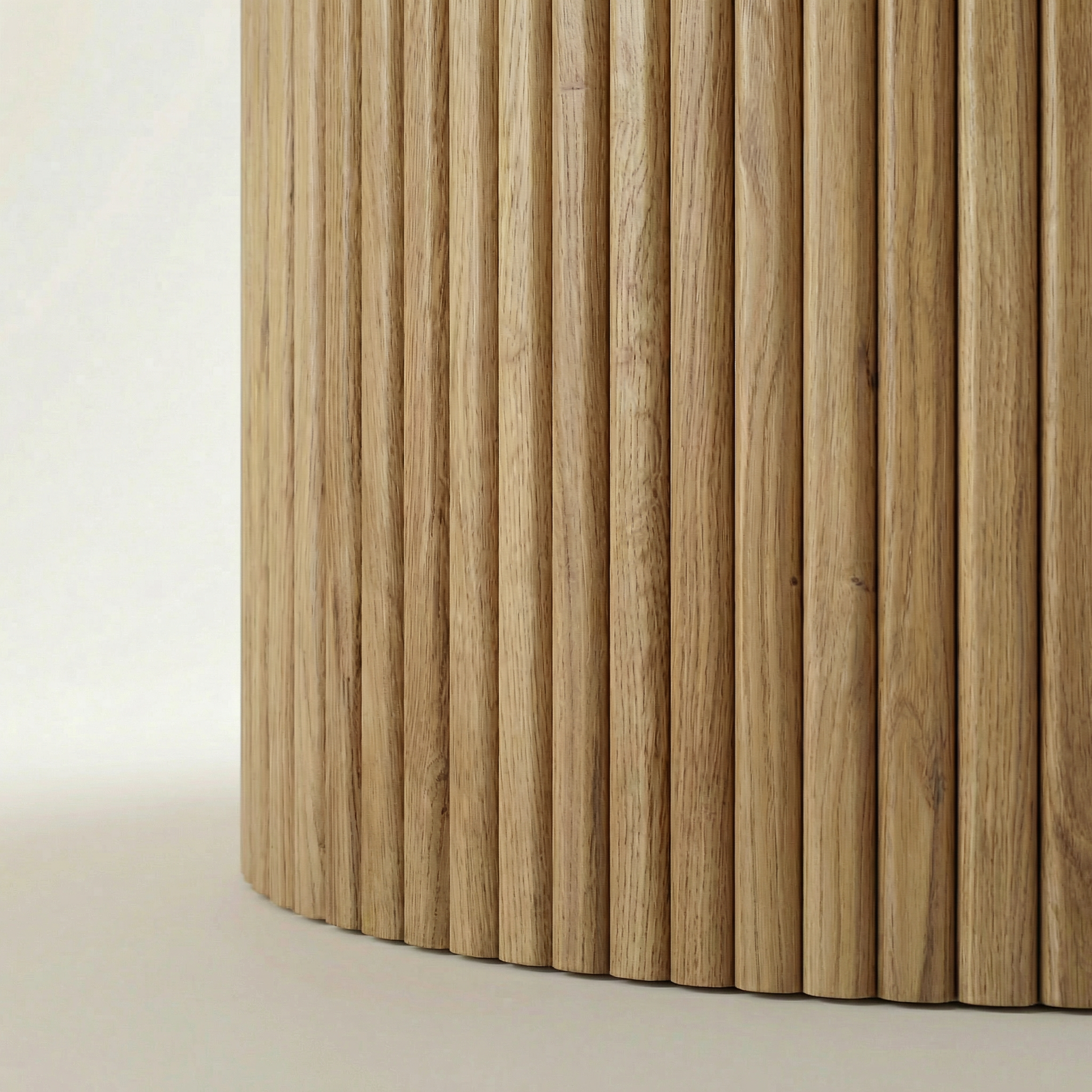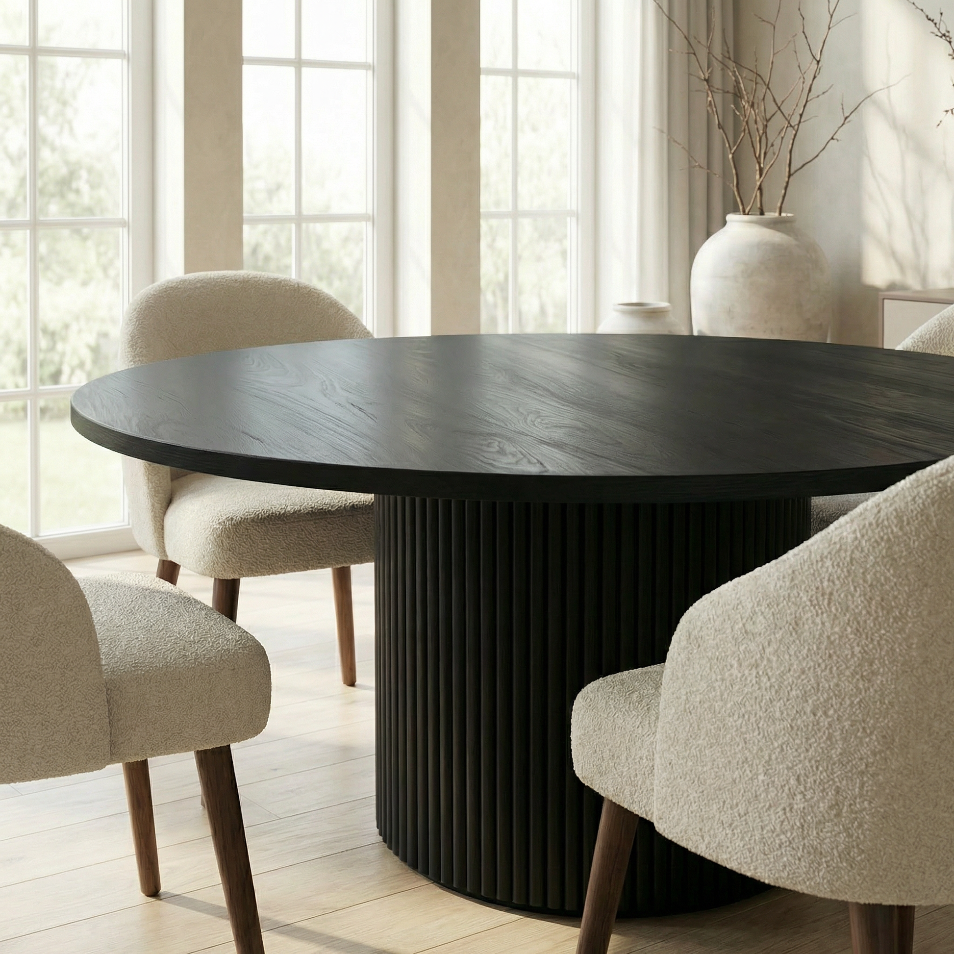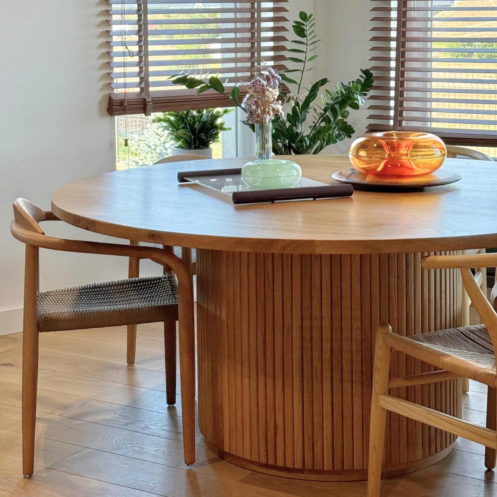 Masa de dining NERO Pure este o masă de dining rotundă realizată integral din stejar masiv, care pune în valoare textura naturală și caracterul autentic al lemnului. Nodurile și fisurile naturale sunt păstrate și umplute cu rășină epoxidică incoloră, pentru durabilitate și un aspect distinctiv, iar suprafața este lăcuită cu finisaje premium, rezistente la contactul cu lichide și uzură.
