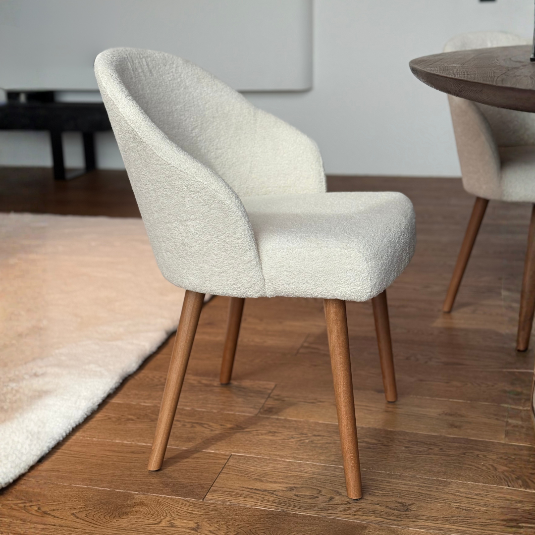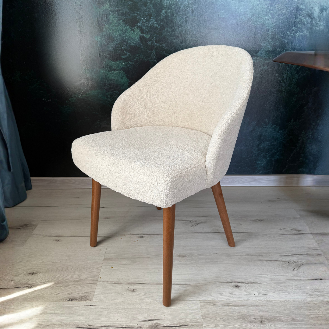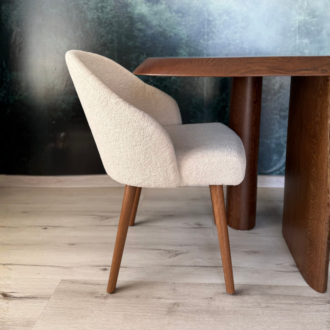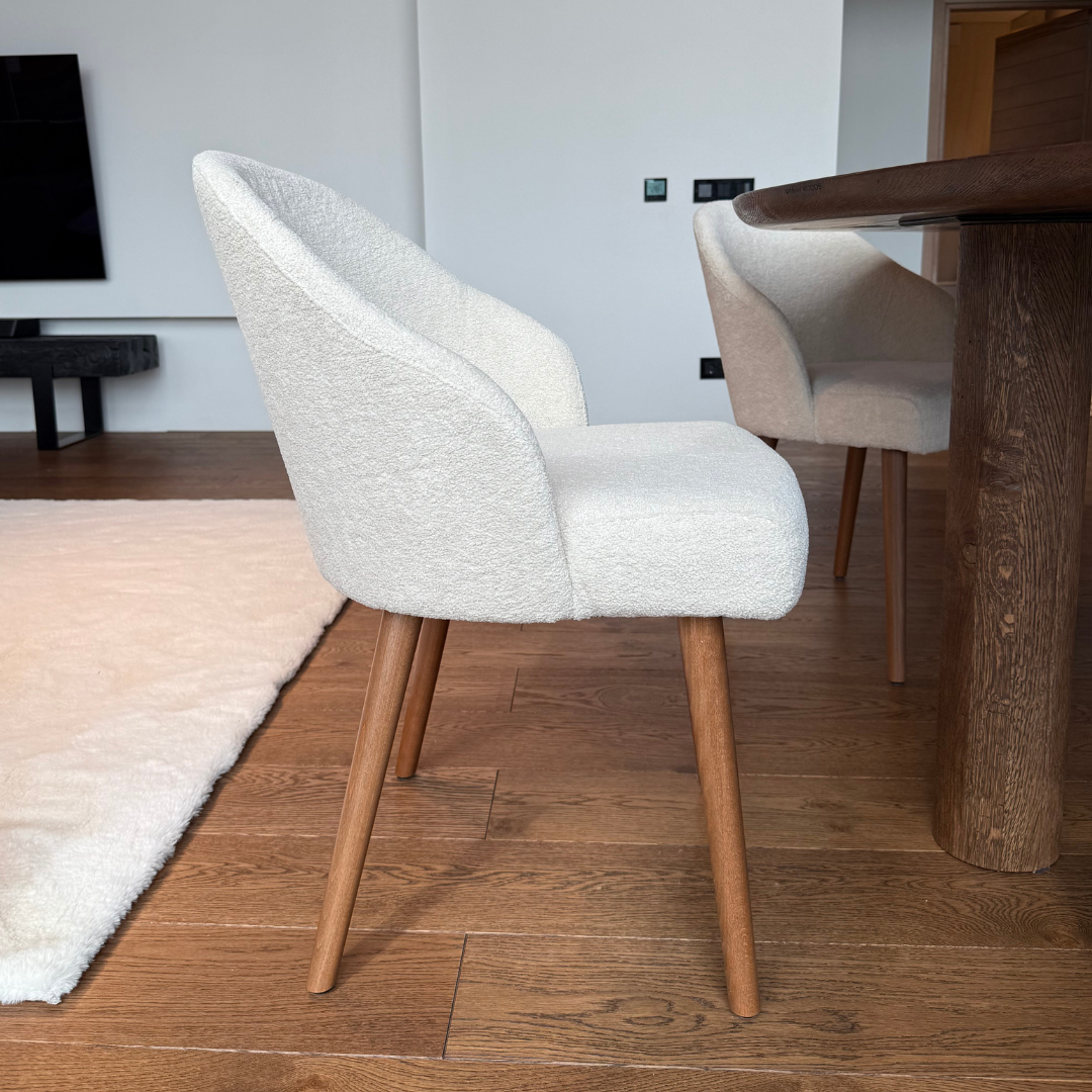 Un scaun extrem de confortabil realizat din lemn masiv in nuanta Dark Oak si cu tapiterie teddy crem extrem de fina.